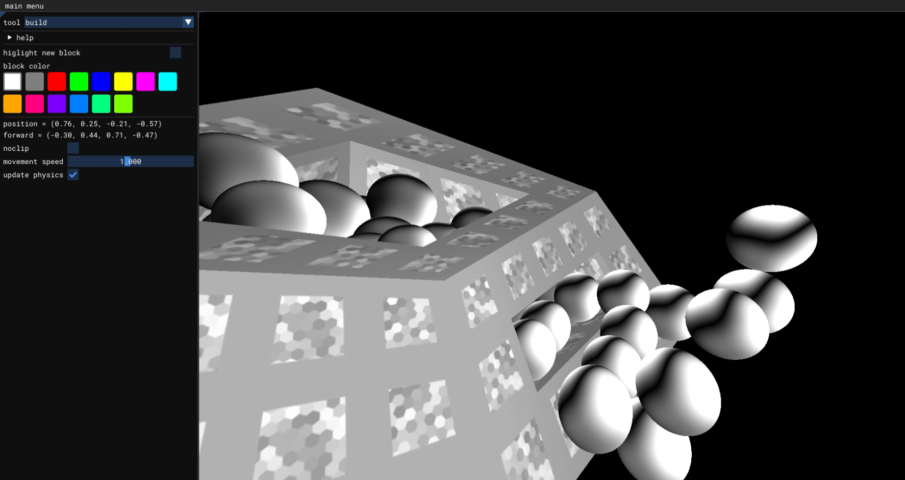 This is awesome thank you for making it! I don't totally understand how everything works (I haven't tried very hard) but I enjoyed placing rhombic dodecahedra at every corner of the top cell of the tesseract in the cellular automata mode. Great job with this!
